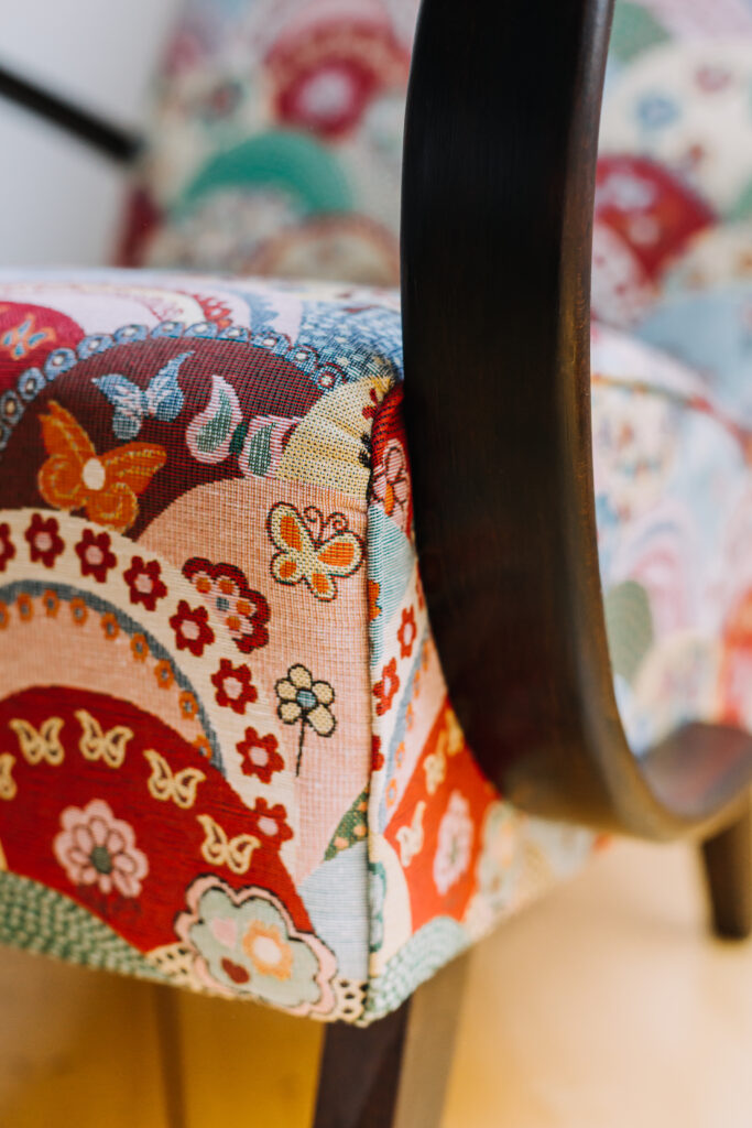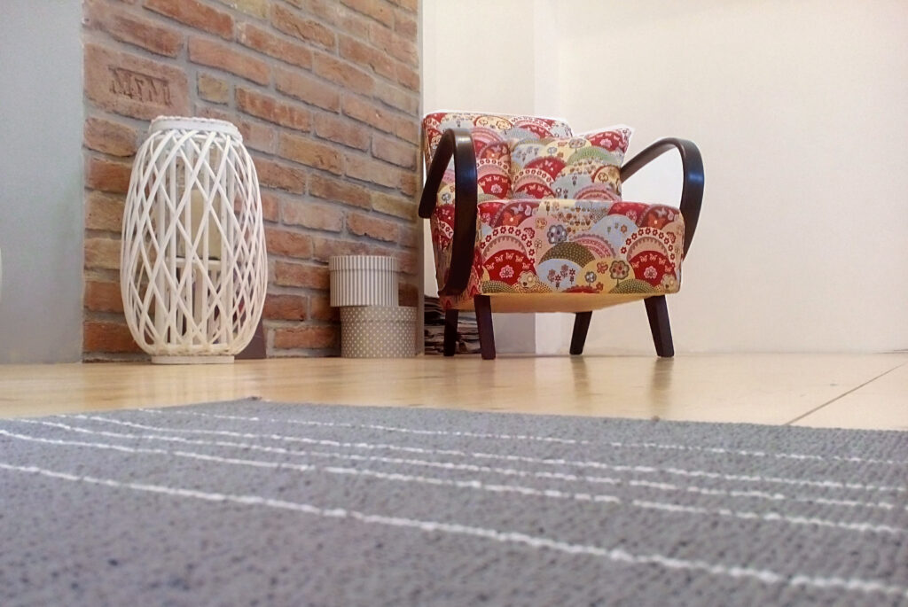 V prvním případě jsme nově potáhli staré křesílko C Halabala. Stalo se krásným funkčním doplňkem ložnice při zdi s cihlovým obkladem. Čalounění svou barevností v jednotlivých zdobných kopcích přírody doplňuje různé přírodní hřejivé odstíny obkladu.