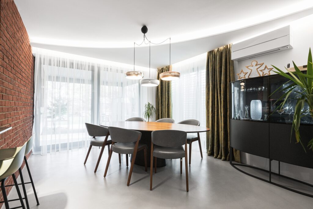 K cihlové zdi, která prorůstá vilou, jsem volila kontrast v hladké dekorační látce. K organze přistupuje závěs s motivy velkých listů. Pro zimní období, kdy na nějaký čas bývá závěs pozadím vánočního stromku, se lépe hodí textilie ve studené stříbrné. V jarním období si své místo na kolejnici za sníženým podsvětleným stropním podhledem najde stejný závěs, ale v barvě kontrastující se zrzavým zdivem, v barvě zelené.