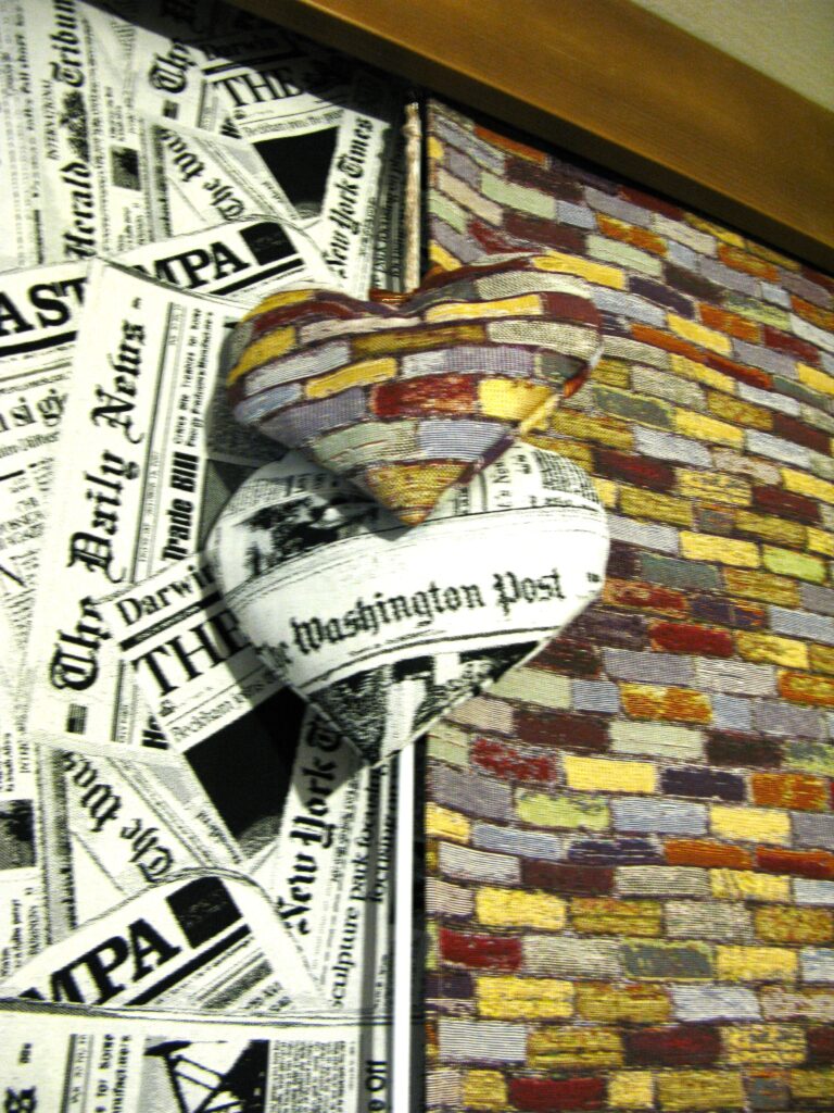 K cihlové zdi je možné vybírat textilii romantickou s hravými motivy z přírody, dekoraci s kovovými odlesky anebo využijeme motiv cihelného zdiva přímo na látce v kombinaci s dekorem novin.