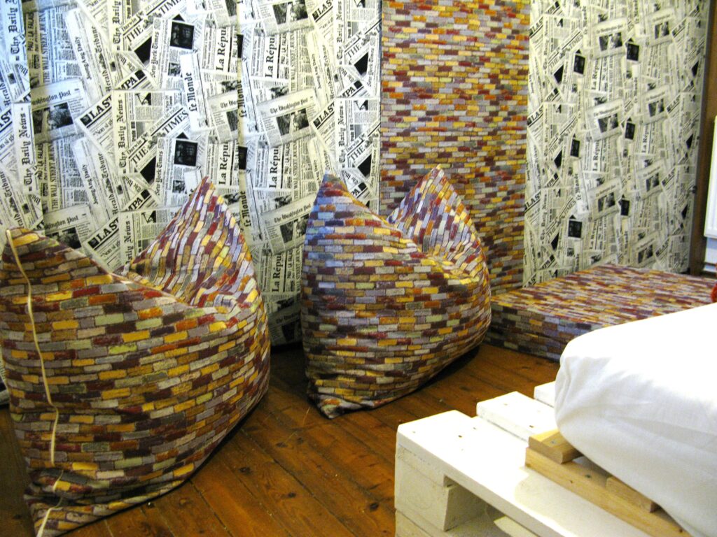 K nábytku z palet mladého páru se výborně hodí hrubší látka s motivy ladrillo – mexické cihelné zdivo. Motiv novin barevnost zklidňuje a dává interiéru svěží nádech. Látka je pevnější, a tak dobře poslouží i pro posuvné panely, z nichž jen jeden je ve vzoru cihel v divoké přírodní barevnosti. „Zdivem“ potažené sedáky společně se stejně očalouněnou matrací poslouží pří lenošení u bílého stolku z palet.