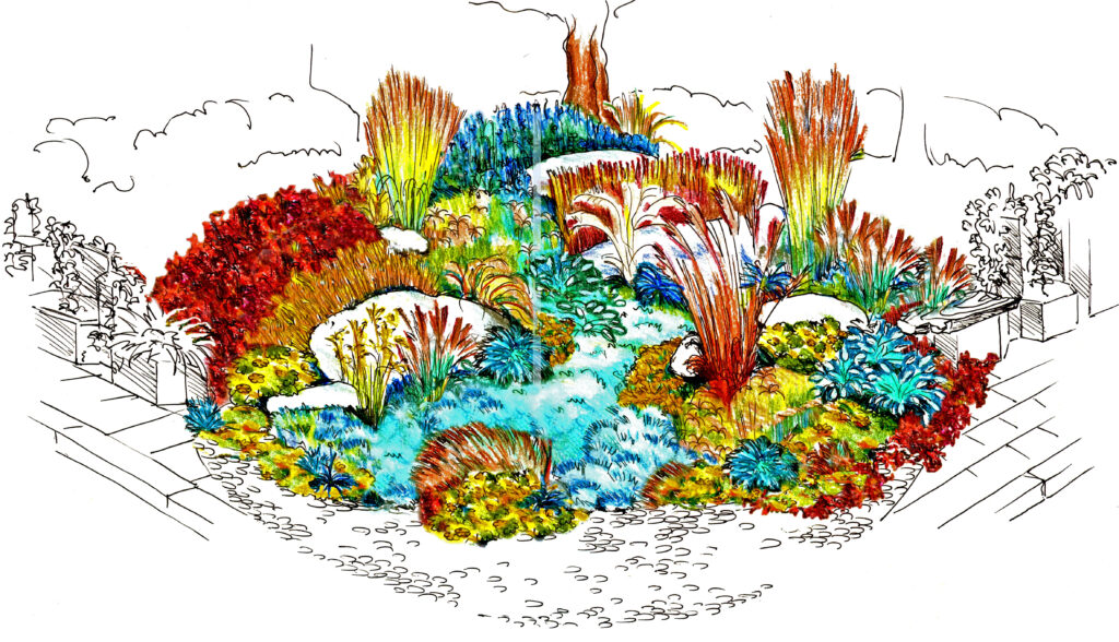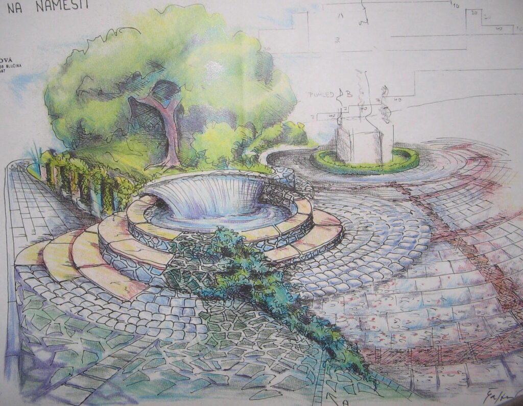Zbytek náměstí je vydlážděn. Zezadu se úzký chodníček potkává se suchým svahem, jehož výsadbu tvoří většinou traviny s bylinkami. Kameny jsme na suchý svah dovezli z místního kopce.