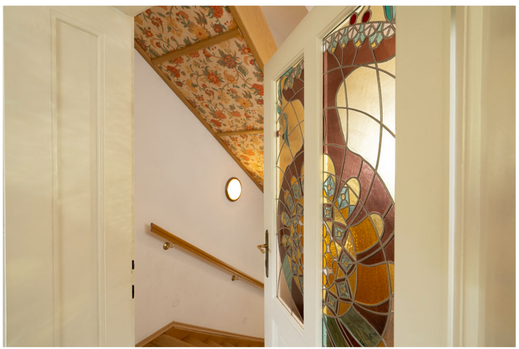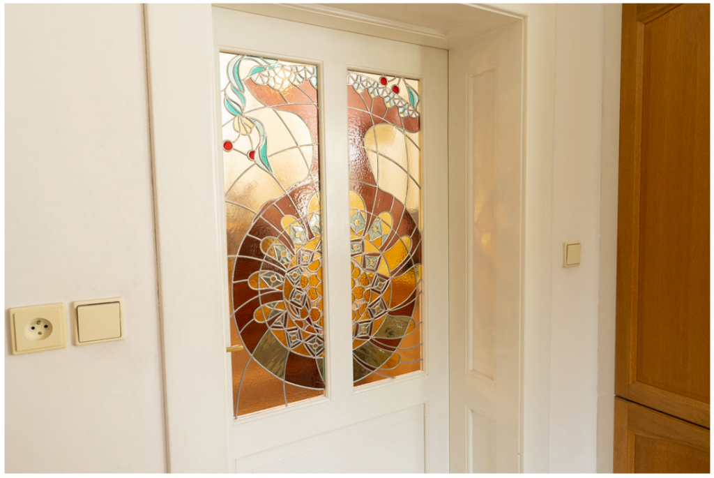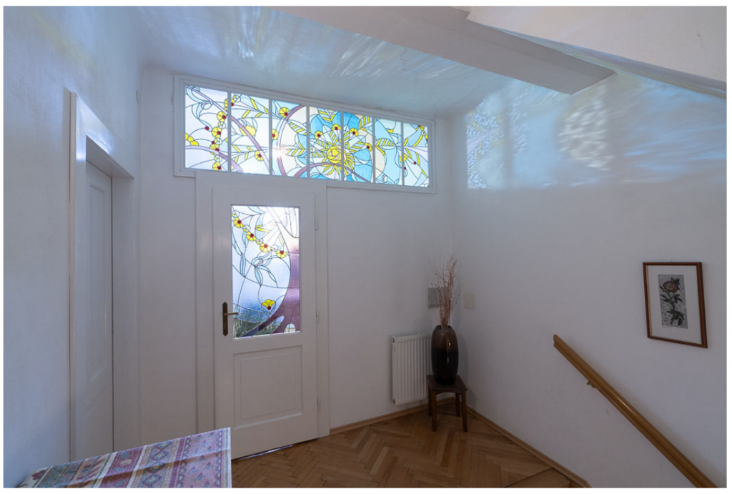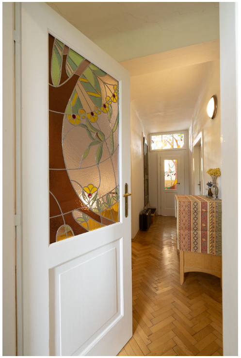 Podle mé předlohy, malované ve formátu 1:1 jsem nechala zhotovit výplně z barevných skel do dveří a nadsvětlíku ve dvou patrech schodišťové haly.