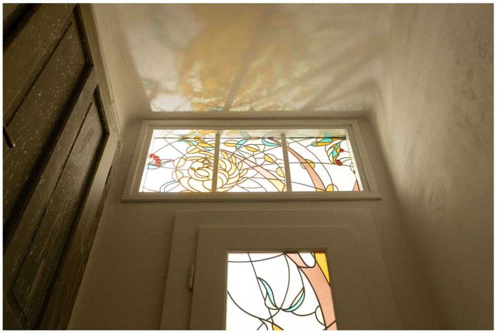 Vitrážové výplně na dvou stranách dvou pater propouští do chodby světlo, jež připomíná barvy jara a podzimu, těmto obdobím jsou přizpůsobeny i motivy barevných sklíček v olovu.