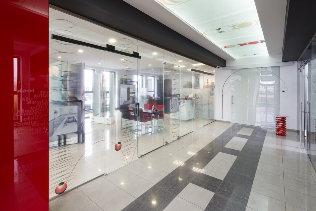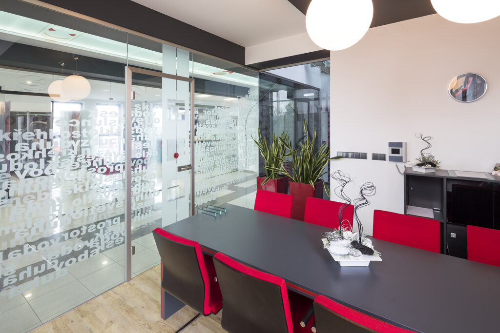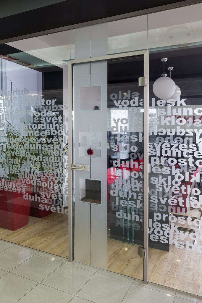 K oku směřuje skleněná stěna s ukázkou digitálního tisku, stěna zasedačky s pískovaným vzorem a stropní podhled z průsvitného, ale neprůhledného skla.