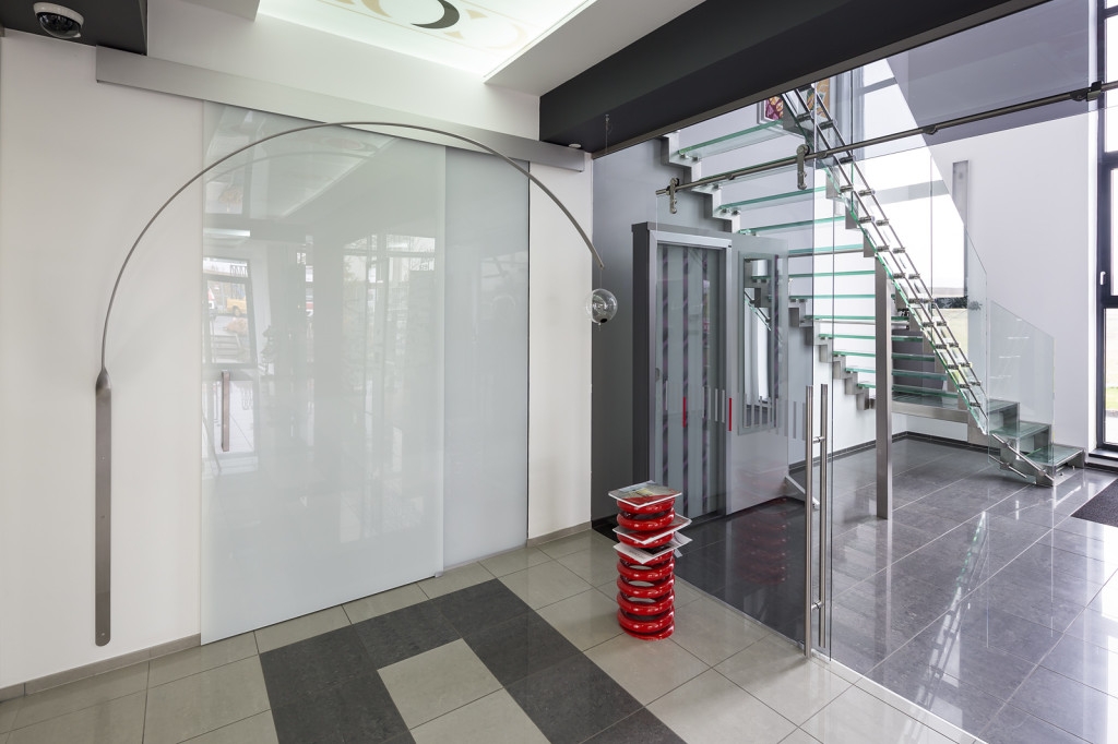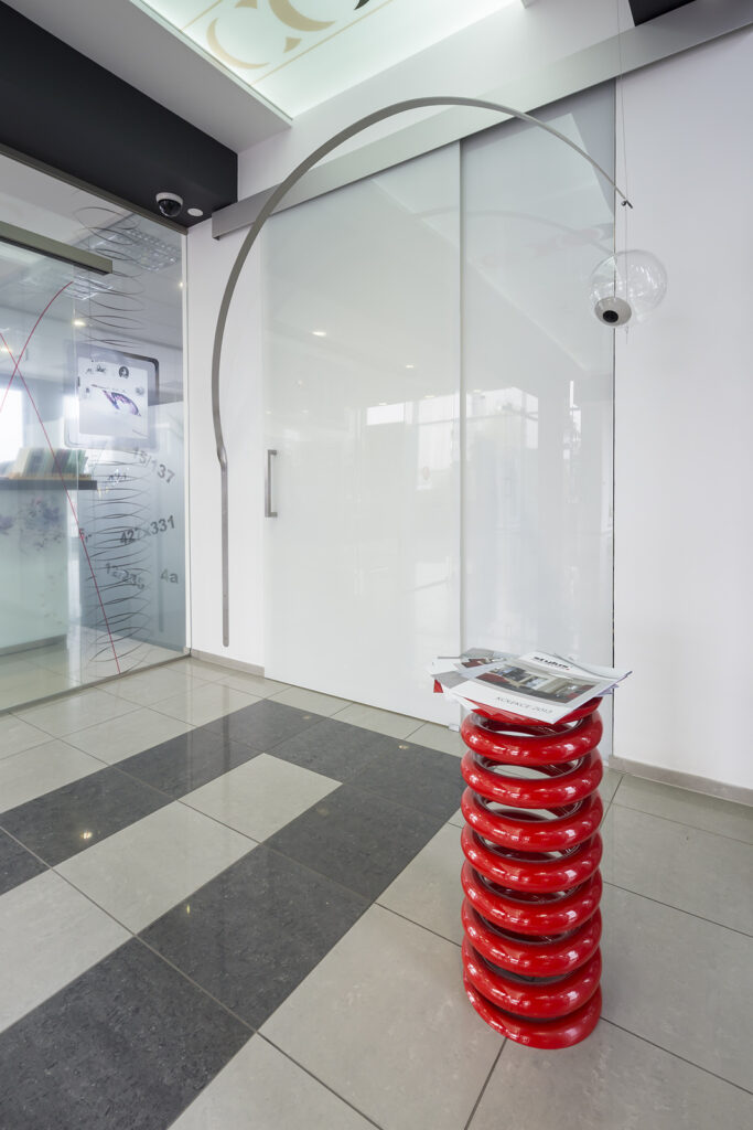 Na dělící stěně chodby a vzorkovny využívá opakující se prvek oka stlačených pružin k postupně zvyšujícím se skokům. Posledním je pak oko na oblouku v reálném provedení. Každá z graficky zpracovaných pružin nese obraz s realizacemi firmy.